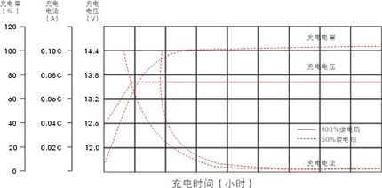 鉛酸蓄電池要求采用限流恒壓的充電方法進行充電。在環(huán)境度為25℃的條件下,最佳的浮充電壓為13.6±0.1V 臺X臺數(shù),充電開始時的電流應限制在0.25C10A的范圍內(nèi)。
