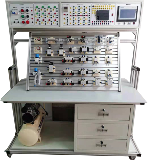 (3)配有控制模塊:電源模塊,PLC控制模塊,繼電器控制模塊,時間繼電器控制模塊、控制按鈕模塊,氣動元件獨立模塊等。