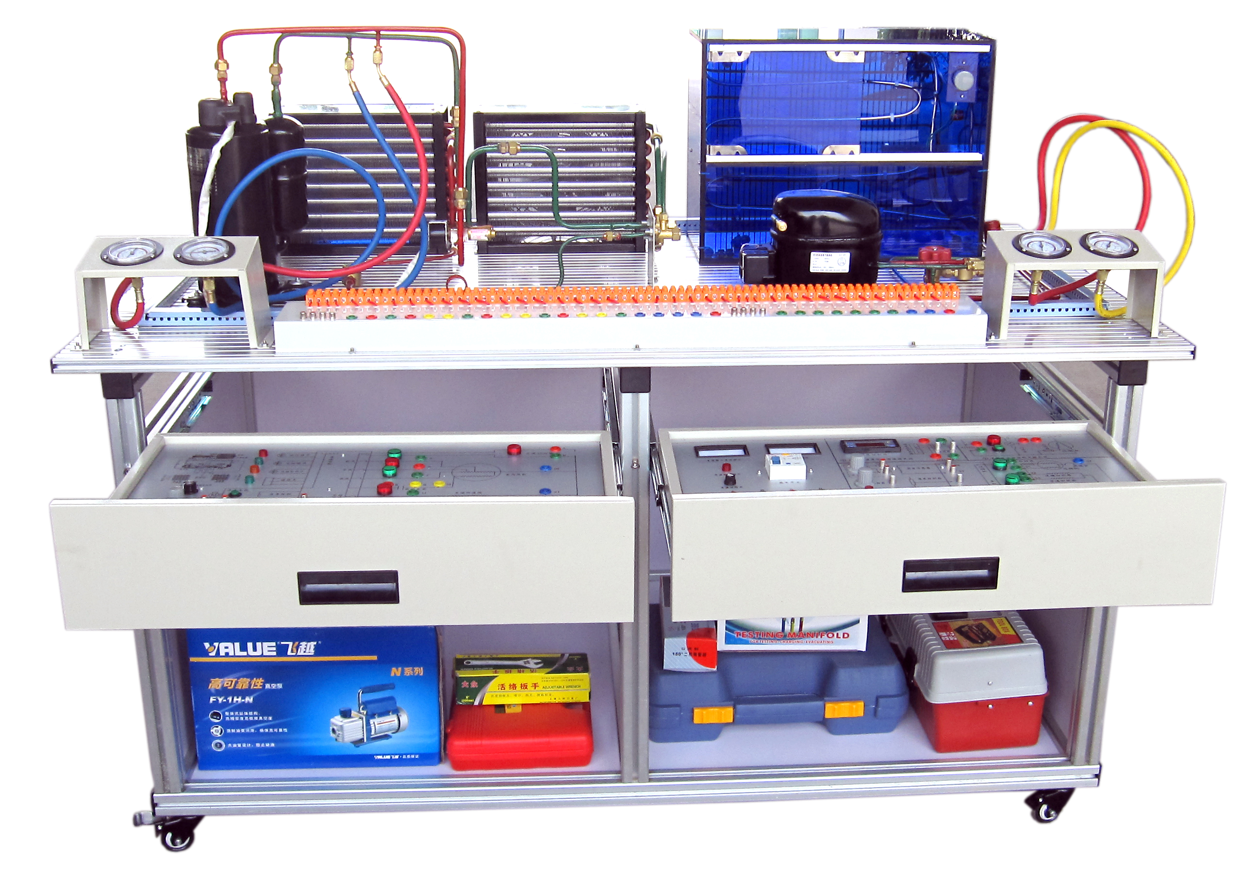 制冷制熱實訓(xùn)設(shè)備、制冷制熱實訓(xùn)裝置是職業(yè)技能課程制冷制熱教學(xué)實訓(xùn)設(shè)備,冰箱實訓(xùn)設(shè)備、空調(diào)實訓(xùn)設(shè)備主要承擔(dān)電類專業(yè)的《制冷制熱技術(shù)》等課程的實訓(xùn)教學(xué)任務(wù),同時可面向社會開展制冷設(shè)備維修工(中、高級)和家用電器產(chǎn)品維修工(中、高級)職業(yè)技能培訓(xùn)與鑒定工作。制冷制熱實訓(xùn)設(shè)備屬于教、學(xué)、做一體化實訓(xùn)室,制冷制熱儀器設(shè)備可供學(xué)生完成《制冷制熱技術(shù)》等課程的實訓(xùn)教學(xué)。主要可對學(xué)生開展冰箱電氣檢修、空調(diào)檢修、空調(diào)移機(jī)、制冷劑加注、管路操作等實訓(xùn)內(nèi)容,并具備制冷維修工技能鑒定資質(zhì)。教學(xué)做、理實一體化,增加了師生之間的互動,提高了教學(xué)效果。在組裝調(diào)試過程中,學(xué)生遇到故障問題,指導(dǎo)老師幫助其分析故障原因,指導(dǎo)學(xué)生動手解決故障問題。制冷制熱實訓(xùn)裝置特色是:實訓(xùn)設(shè)備全面的涵蓋了制冷、制熱等電器的所有原理性電路,既能夠讓學(xué)生迅速融入實物學(xué)習(xí)的外觀體現(xiàn),也能夠?qū)﹄娖鞯慕Y(jié)構(gòu)和組成有清楚的認(rèn)識。實訓(xùn)室有大量的舊冰箱、空調(diào)實物可供學(xué)生拆卸、組裝,讓學(xué)生對制冷制熱設(shè)備有更加深刻的理解。通過實制冷制熱實訓(xùn)教學(xué),可使學(xué)生熟悉常用儀器儀表,熟練使用儀器儀表,更好的掌握制冷制熱裝置的維修技術(shù),為以后的發(fā)展奠定基礎(chǔ),從而提高學(xué)生實際動手能力和就業(yè)競爭力。制冷設(shè)備運用與維修,培養(yǎng)在制冷與空調(diào)制造行業(yè),從事產(chǎn)品設(shè)計、技術(shù)管理與質(zhì)量管理;在制冷與空調(diào)設(shè)備經(jīng)營行業(yè),從事產(chǎn)品的銷售、售后服務(wù)和經(jīng)營管理;在制冷與空調(diào)設(shè)備使用單位,從事制冷與空調(diào)系統(tǒng)運行管理和操作維修的中、高技能人才。制冷技術(shù)、制冷基礎(chǔ)技能實訓(xùn)、冰箱、家用空調(diào)器原理與維修、工程熱力學(xué)、電工基礎(chǔ)及實訓(xùn)、電力拖動原理與技能實訓(xùn)、工程制圖與CAD、中央空調(diào)運行管理與維護(hù)、汽車空調(diào)安裝及維修、冷庫設(shè)計安裝與維護(hù)、制冷空調(diào)自動控制技術(shù)等課程。畢業(yè)就業(yè)方向:空調(diào)生產(chǎn)企業(yè)的質(zhì)檢、工藝、基層管理、生產(chǎn)設(shè)備維護(hù)工作,中央空調(diào)、冷庫的安裝、運行管理、維護(hù),空調(diào)工程的預(yù)算、輔助設(shè)計工作,空調(diào)、冷庫和制冷設(shè)備等空調(diào)制冷行業(yè)的營銷、銷售代理、售后服務(wù)工作。 上海碩博弘揚大國工匠精神, 發(fā)展職業(yè)教育,應(yīng)用教學(xué)設(shè)備,為企業(yè)培養(yǎng)高技能人才,而專業(yè)生產(chǎn):制冷與空調(diào)實訓(xùn)設(shè)備、可視化制冷性能測試培訓(xùn)裝置、一機(jī)兩庫系統(tǒng)綜合實訓(xùn)裝置、小型冷庫制冷系統(tǒng)綜合實訓(xùn)考核裝置、小型冷庫制冷系統(tǒng)實訓(xùn)考核裝置、熱空調(diào)制冷制熱系、實訓(xùn)考核裝置、整體式空調(diào)電氣實訓(xùn)智能考核裝置、變頻空調(diào)電氣實訓(xùn)智能考核裝置、空調(diào)冰箱組裝與調(diào)試實訓(xùn)考核裝置(智能考核型)、制冷系統(tǒng)原理與性能測試多功能實驗裝置、空調(diào)與冰箱組裝及電氣控制系統(tǒng)原理與維修實訓(xùn)臺、現(xiàn)代制冷與空調(diào)系統(tǒng)實訓(xùn)考核裝置、電冰箱制冷系統(tǒng)實訓(xùn)考核裝置(直冷)、冰箱技能實訓(xùn)考核裝置、家用電冰箱微電腦式溫控電氣實訓(xùn)考核裝置、空調(diào)/冰箱制冷制熱實訓(xùn)考核裝置、變頻空調(diào)電氣實訓(xùn)智能考核裝置、半導(dǎo)體制冷技術(shù)實訓(xùn)裝置、智能型制冷壓縮機(jī)性能測試實訓(xùn)裝置、柜式空調(diào)技能綜合實訓(xùn)考核裝置、制冷電路電氣控制實訓(xùn)板、制冷管路維修基本技能實訓(xùn)裝置、壓縮機(jī)解剖,拆裝實訓(xùn)設(shè)備、制冷制熱實驗室設(shè)備、整體式空調(diào)電氣實訓(xùn)考核裝置、低溫箱電氣實訓(xùn)智能考核裝置、一機(jī)兩庫電氣實訓(xùn)考核裝置、組合式空調(diào)機(jī)組實訓(xùn)裝置、空調(diào)制冷綜合實訓(xùn)裝置、除濕機(jī)維修技能與考核裝置、空調(diào)制冷換熱綜合實驗裝置、制冷制熱維修測試綜合實訓(xùn)平臺、制冷壓縮機(jī)性能測定實驗裝置、制冷制熱實驗室設(shè)備(制冷制熱實驗臺、制冷空調(diào)實驗臺)、變頻空調(diào)制冷制熱實驗室設(shè)備、變頻空調(diào)實驗臺、蓄冷空調(diào)制冷技術(shù)實訓(xùn)裝置、熱泵型分體空調(diào)實訓(xùn)考核裝置、空調(diào)維修操作實訓(xùn)裝置、空調(diào)維修操作實驗臺、空調(diào)安裝調(diào)試實訓(xùn)裝置、空氣源熱泵技術(shù)實訓(xùn)考核裝置。