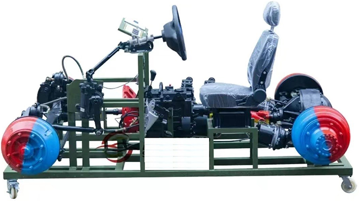 該設備采用翻新豪沃ZZ1167底盤各系統(tǒng)為基礎,充分展示汽車底盤各系統(tǒng)的組成結構。包括汽車前后懸掛系、轉向系、傳動系、手動變速器及掛檔機構、制動系等系統(tǒng)、安裝腳輪的可移動式臺架等組成。