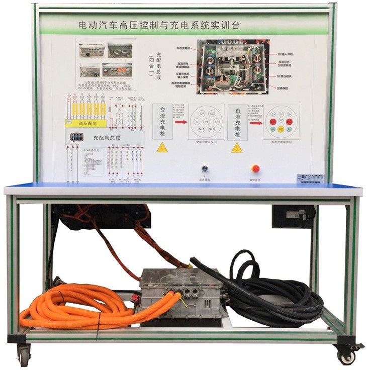 國標充電槍與充電座、(北汽EV160純電動汽車)高壓配電箱(帶各類高壓繼電器)、漏電傳感器模塊、絕緣傳感器模塊、安全維修塞模塊、漏電模擬操作單元、高壓安全系統(tǒng)操作單元、操作控制臺、訓(xùn)練控制按鈕、直流接觸器(包含充電繼電器、總正繼電器、總負繼電器、預(yù)充繼電器)、一體化全鋁合金型材搭建的移動臺架(1500×700×1700mm 帶自鎖腳輪裝置,帶安裝檢測端子的原理面板,面板1448×940mm)、設(shè)備操作說明書。