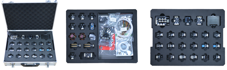 模塊包含LED燈模塊、按鍵模塊、RGB彩燈模塊、蜂鳴器模塊、人體感應(yīng)傳感器、光敏傳感器、溫度傳感器、濕度傳感器、OLED顯示模塊、模擬量傳感器、直流電機(jī)模塊、氣壓傳感器模塊等十五余種模塊、傳感器通過4P連接線連接到通用擴(kuò)展板。