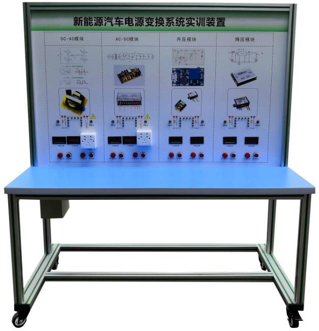 DC-AC模塊(12V轉(zhuǎn)220V)、點(diǎn)火開關(guān)、AC-DC模塊(220V轉(zhuǎn)12V)、升壓模塊(12V轉(zhuǎn)24V)、降壓模塊(24V轉(zhuǎn)12V)、發(fā)光二極管閃光燈燈條、指示燈、操作開關(guān)、接觸器、急停開關(guān)、一體化全鋁合金型材搭建的移動(dòng)臺(tái)架(1500×700×1700mm 帶自鎖腳輪裝置,帶安裝檢測(cè)端子的原理面板,面板1448×940mm)、設(shè)備操作說明書。