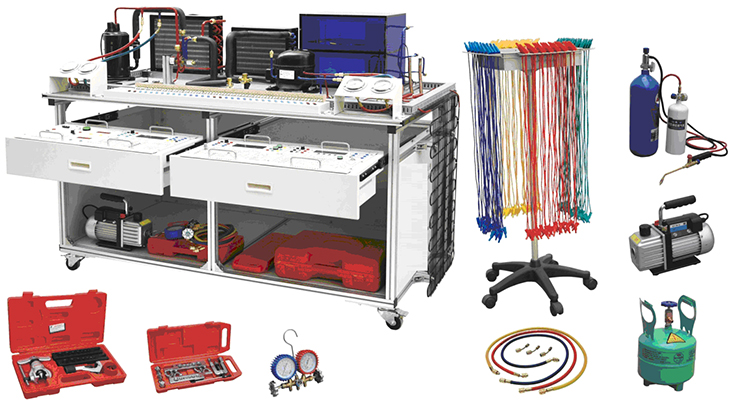 1、實訓臺采用鋁型材臺架加實訓模塊結(jié)構(gòu),裝置采用一體化設(shè)計,由導(dǎo)軌式鋁合金安裝平臺、空調(diào)系統(tǒng)、電冰箱系統(tǒng)、電氣控制系統(tǒng)等組成。底部安裝有四個帶剎車的腳輪,可以方便的移動和固定。設(shè)備配置空調(diào)制冷系統(tǒng)管路1套、直冷電冰箱制冷系統(tǒng)管路1套、安全插端子排,壓力表(1.5MPa)2只(3.5 MPa)2只等。